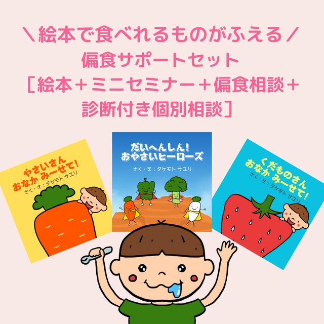 お子さまの好き嫌いに悩むママ・パパへ。 管理栄養士による「偏食のタイプ診断」と 「個別オンライン相談」で、今日から実践できる“食卓の工夫”をお伝えします。 偏食以外の相談でもOKです。食に関する悩みを誰かと話したい・・・。 そんな方もお気軽にお申し込みください。 【内容】 15分のミニ食育セミナー(動画 or Zoom) テーマ:「好き嫌いを減らす、食べ方・声かけのコツ」 → 今日からすぐ使える、家庭での“ひと工夫”をご紹介。 偏食診断+15分の個別オンライン相談(Zoom) ・偏食のタイプを診断 ・お子さまの特徴に合わせた改善プランをご提案 ・食事の組み立て方や声かけ方法を具体的にアドバイス 【こんな方におすすめ】 ・お子さまの好き嫌いに悩んでいる ・偏食っ子の食事作りに疲れてしまった ・初めての食育何から始めればいいのかわからない ・親子で楽しく学びながら改善したい 【お客様の声】 「食育の絵本も一緒に購入しました。絵がほのぼのしてて全部可愛い♡ 私は料理が苦手だから、子供にはこの絵本を読んで料理上手になってもらいたい。 子供たちはおやさいヒーローズの絵本が大好き! ピーマンが苦手だから、ケチャップと一緒に食べさせてみます」 (30代・幼稚園児ママ) 【講師紹介】 タケモト サユリ(管理栄養士・農学博士) 食品メーカーや国立循環器病研究センターでの研究や市民向けの食育、 病院食のメニューを小学校給食にアレンジし導入してきた活動を経て、 現在は「食育絵本作家」「食育講師」として活動中。 1児の偏食っ子をもつママとして、子どもの食事に悩んでいるママを 少しでもハッピーになってもらいたいと願い 子どもの味覚や食習慣づくりをサポートしています。 【ご利用の流れ】 本商品をご購入(チケットをダウンロードします) ↓ メールにて日程調整のご連絡 ↓ Zoomリンクをお送りし、当日ご参加 ※キャンセルや日程変更については事前にご相談ください。 【ご注意・免責事項】 本サービスは、管理栄養士による 食育・栄養相談 を目的としています。 病気の診断や治療を行う 医療行為ではありません。 持病や治療中の方は、必ず主治医の指示に従ってください。 また、当サービスで得られた情報やアドバイスを実践される際は、 必ずご家庭の状況やお子さまの体調に合わせてご判断ください。