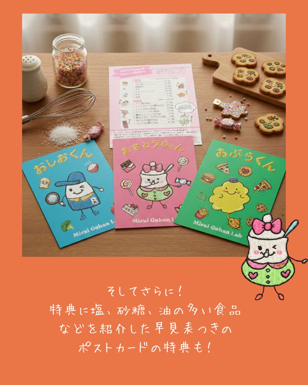 塩・砂糖・油の多い身近な食品をまとめた早見表ポストカードを特典としてお付けします。